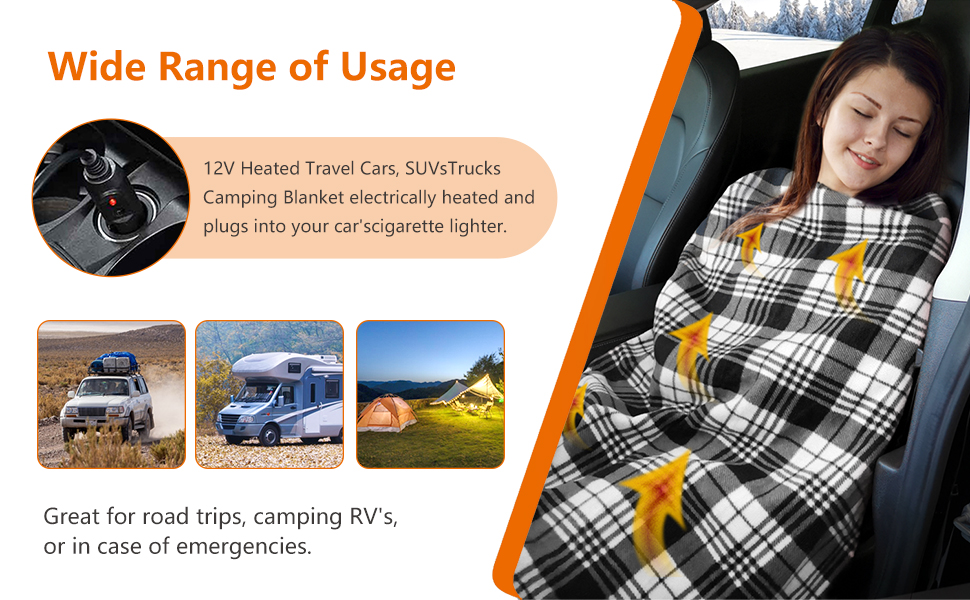 • 【COMFORTABLE MATERIAL】It is made by soft comfortable polyester fabric fleece. Our heated car blanket will  keep your body warm in winter like sleeping in the sunshine.