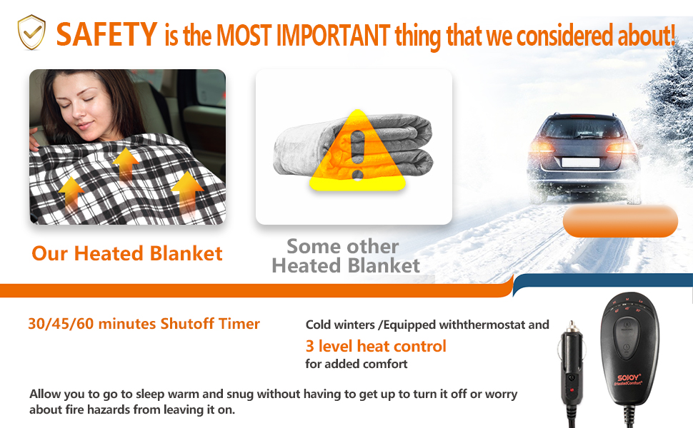 • 【OVERHEATING PROTECTION】Sojoy heated car blanketS are equipped with thermostat to keep constant warmth and for overheating protection.