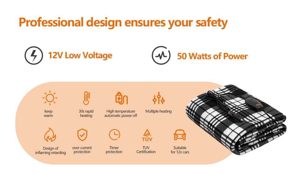 • 【AUTO OFF】This electric heated car blanket is equipped with 30/45/60 minutes timer and will auto shut off to protect your car battery.