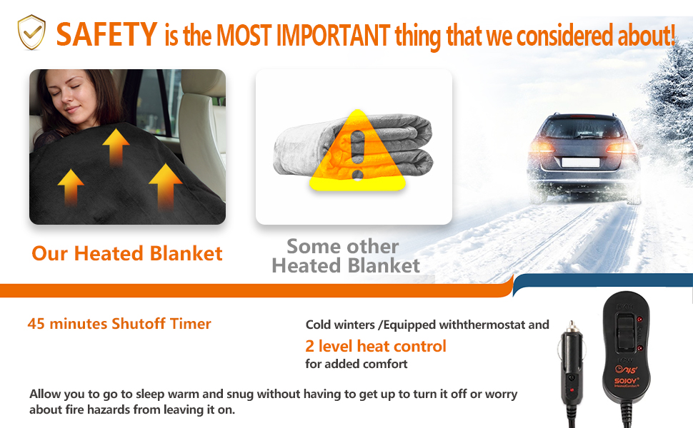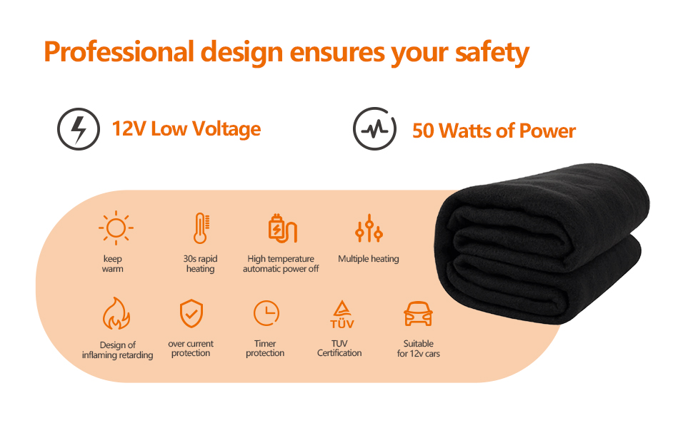 • 【AUTO OFF TIMER】The electric heated blanket will auto shut off after 45mins. This function allows you to use the heated blanket safely if you forget to unplug the power supply when leaving the car in a hurry. More safe and reliable.