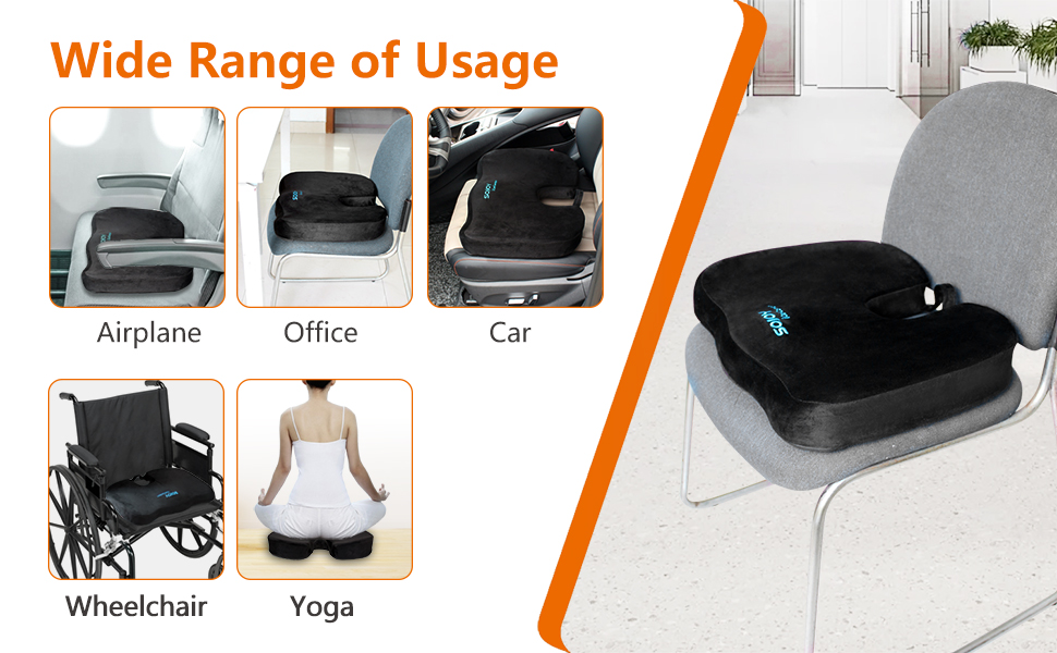 - 【PERFECT FOR ANYWHERE YOU SIT】Sojoy office seat cushion is universal fit for car seats, home office chairs,stadium seats and wheelchairs. Great for sporting events,airplane travel and road trip.